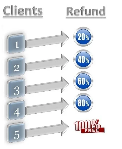 You will receive a 20% refund for each client referred (up to 5) off of your already paid tax invoice for preparation services for the current year. If you refer 5 or more clients then your tax preparation services for that year will be free!